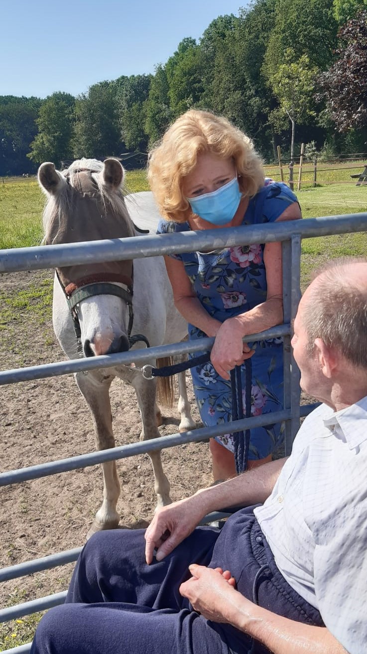 Net als voorgaande jaren hebben we weer stalbezoek gehad van de cliënten en hun familie van het zorgcentrum waar Wilma werkzaam is. Dit keer vier dagdelen om zoveel mogelijk cliënten de gelegenheid te geven om mee te gaan. Even in een andere omgeving met pony’s, veulens, kippen en de tuin die volop in bloei staat. En niet te vergeten onze hond Jill.