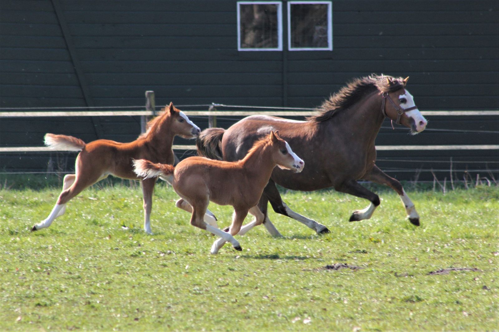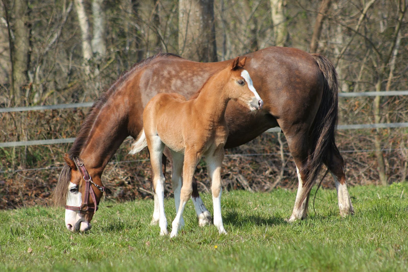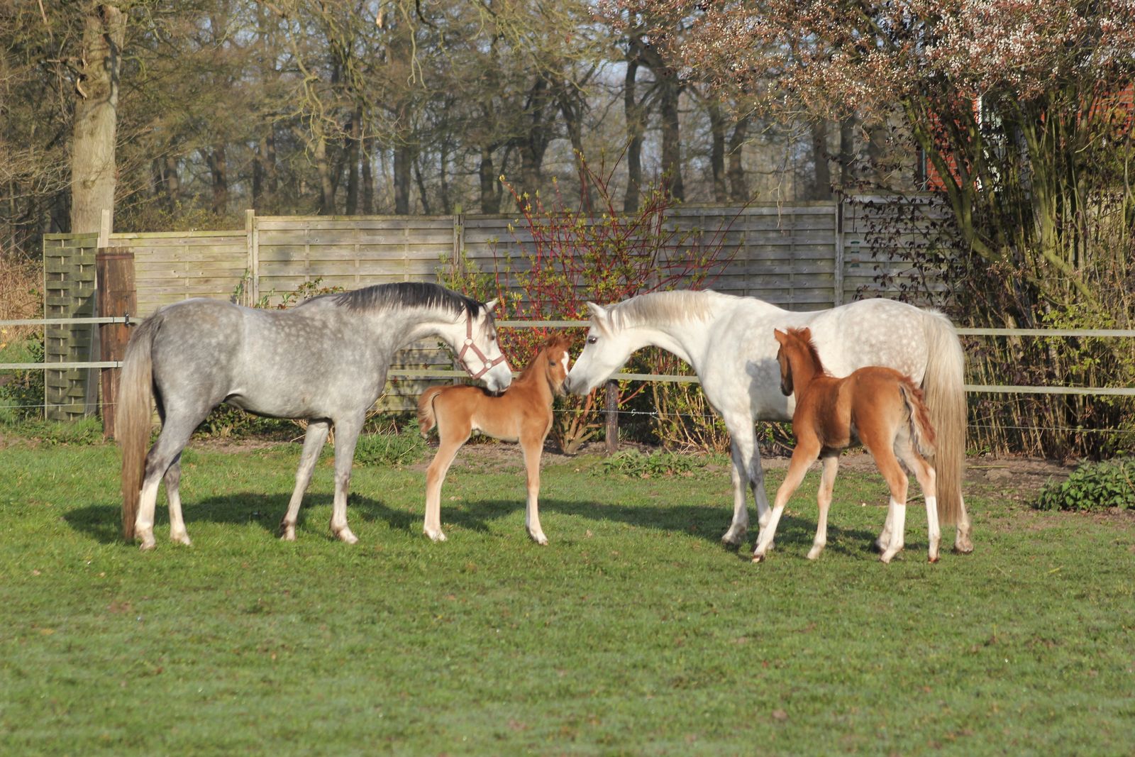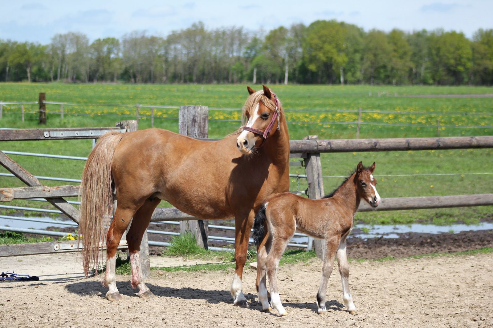 merrie met een jong veulentje bij in de wei komt. Maar het gaat eigenlijk altijd
