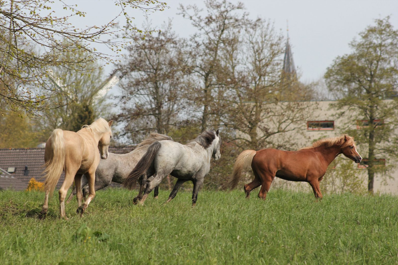 Zoals elk jaar gaan onze jonge hengsten in opfok in het voorjaar naar de hengstenweide op de Groningerklei. De jaarling Lakeway’s Valentino en de 2-jarige Kingston lopen samen met twee andere jonge hengsten en mogen daar tot de herfst lopen. Een mooi kleurenpallet, twee schimmels een vos en een palomino. Ze hebben veel bekijks, want ze lopen (tijdelijk) midden in het dorp. Daar kan iedereen genieten van deze jonge hengsten die heel wat af ravotten. We zijn benieuwd hoe zij zich ontwikkelen. We zullen het in de herfst weten.
