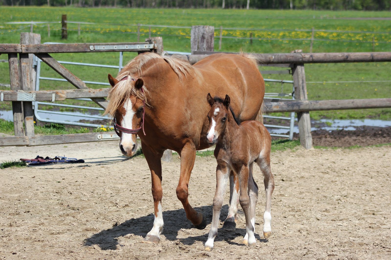 Wanneer we 7 juni ’s avonds over de stal lopen horen we het geluid alsof Adelaine (keur) tegen de stalwand staat te schuren. Als we kijken staat ze echter rustig midden in de stal ons aan te kijken. En toch horen we het geluid. Tot onze verrassing staat haar pasgeboren veulen tegen de wand te stoten in de poging om te gaan staan. En dat was wat wij hoorden.